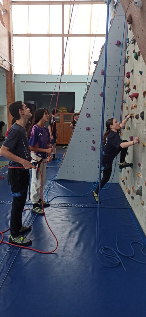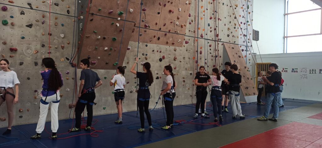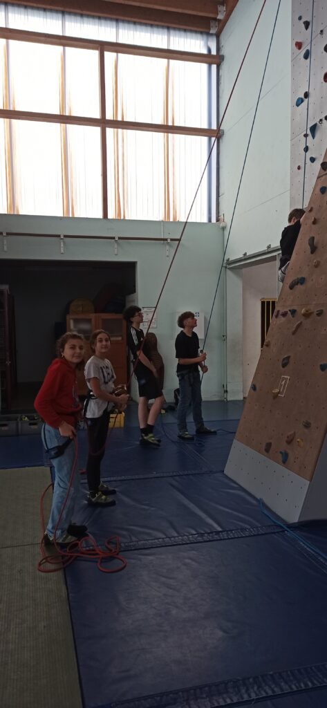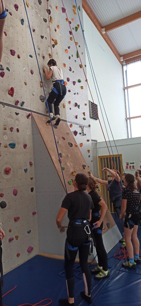Une fois l’échauffement dirigé et l’équipement de chaque élève réalisé avec mise en place du baudrier, chacun a tenté l’ascension de plusieurs voies. Si les grimpeurs ont bien transmis leurs compétences sécuritaires, la gestion des émotions n’était pas une mince affaire. Certains à l’aise et forts de l’expérience des années précédentes ont réussi à atteindre les sommets des voies, voire même en devers pour l’un d’eux.